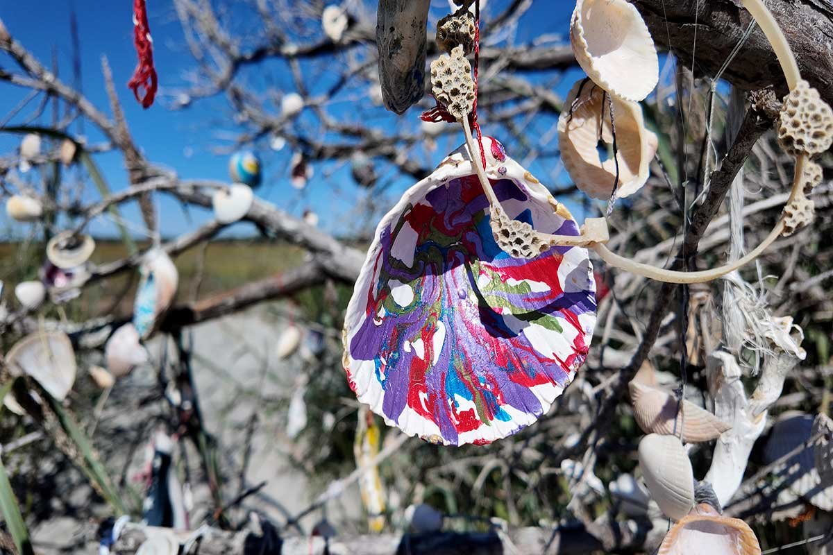 At the far end of Folly Beach, just north of the county park where the island begins to thin out and the crowds fall away, there is a tree that most visitors don’t know to look for. It grows from the soft sand of the Carolina shoreline, and when you get close enough, you start to notice what’s been left in its branches — shells woven into the limbs, necklaces of shells marking its trunk, small offerings pressed into the bark by people who came here with something on their minds.